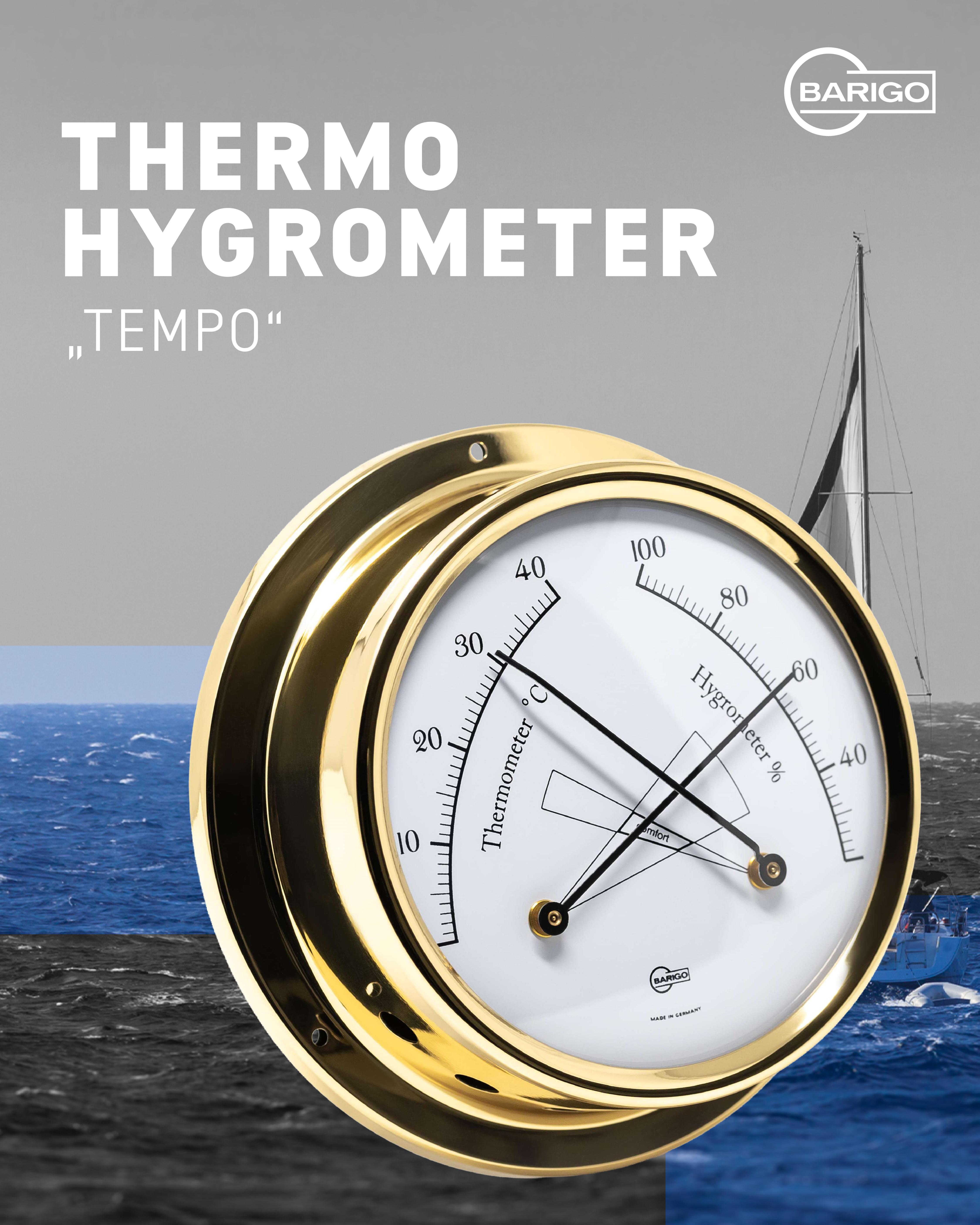This thermo-hygrometer from the TEMPO series features a polished brass housing (diameter 110 mm)